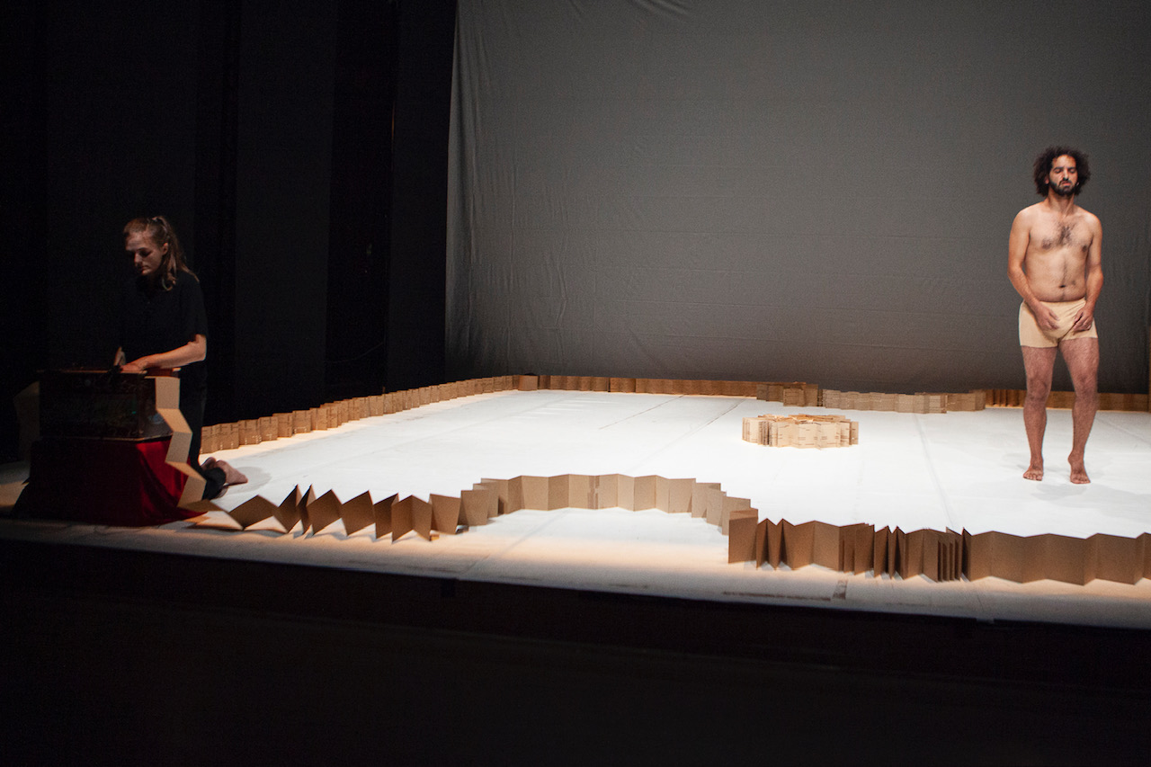 Moad et Lara évoluent sur le plateau au son de l’orgue de barbarie et au sein d’une scénographie en mouvement faite de leurs compositions sur cartons perforés.